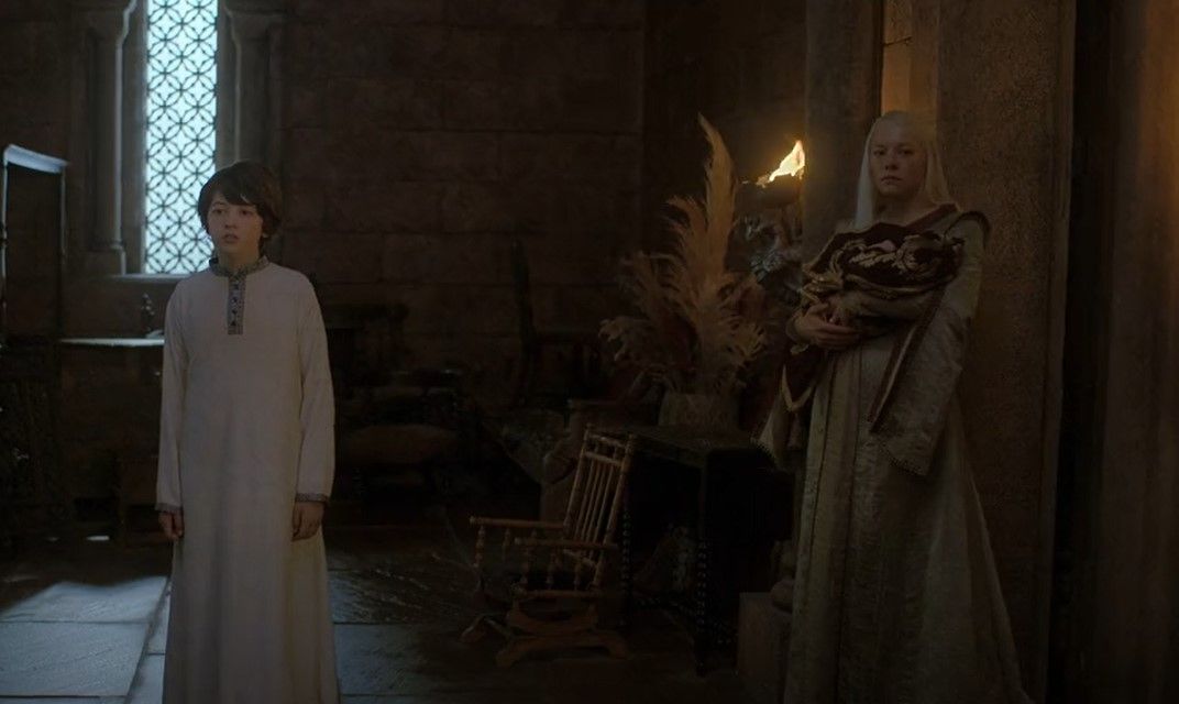 Rhaenyra reprimands Laenor for naming the child without consulting her as they make their way back down the hallway, leaving blood all over the place. Then they go to their other two sons, who are chatting with Ser Harwin and have picked a dragon’s egg for their younger sibling’s cradle. Ser Harwin “Breakbones” Strong, the head of the City Watch, and the princess exchange some incredibly important ones. Furthermore, the older brothers unquestionably lack Laenor’s coloring. Rhaenyra and Laenor’s oldest boys train in the dragon pit with Aegon and Aemond. Other lads mock Aemond for not having a dragon. After they leave, he sneaks into the dragons’ lair and nearly gets flambéed.