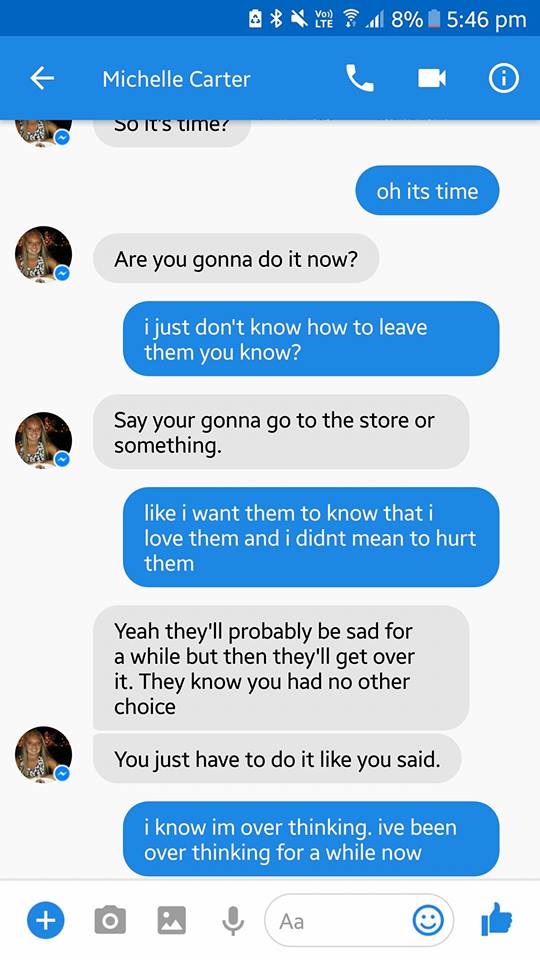 Carter: “Conrad. I told you I’ll take care of them. Everyone will take care of them to make sure they won’t be alone and people will help them get thru it. We talked about this, they will be okay and accept it. People who commit suicide don’t think this much and they just do it”