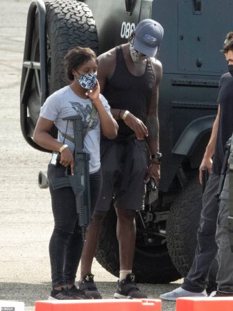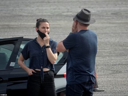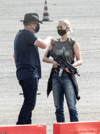 Vanessa also looks ready to shoot a dramatic scene while holding a machine gun onset and following instructions from director Christopher Macquarie. New Movie: Hailey is seen on set in a blue shirt and black jeans talking to director Christopher McCauary in his mask.