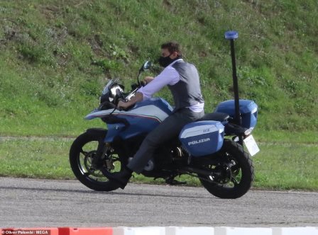 Tom Cruise spends on set on a motorbike and does donuts at a BMW in Rome. He also looked like an inch of action spy as he filmed the scene with a long line of police cars, remembering to keep his mask on his face between takes.