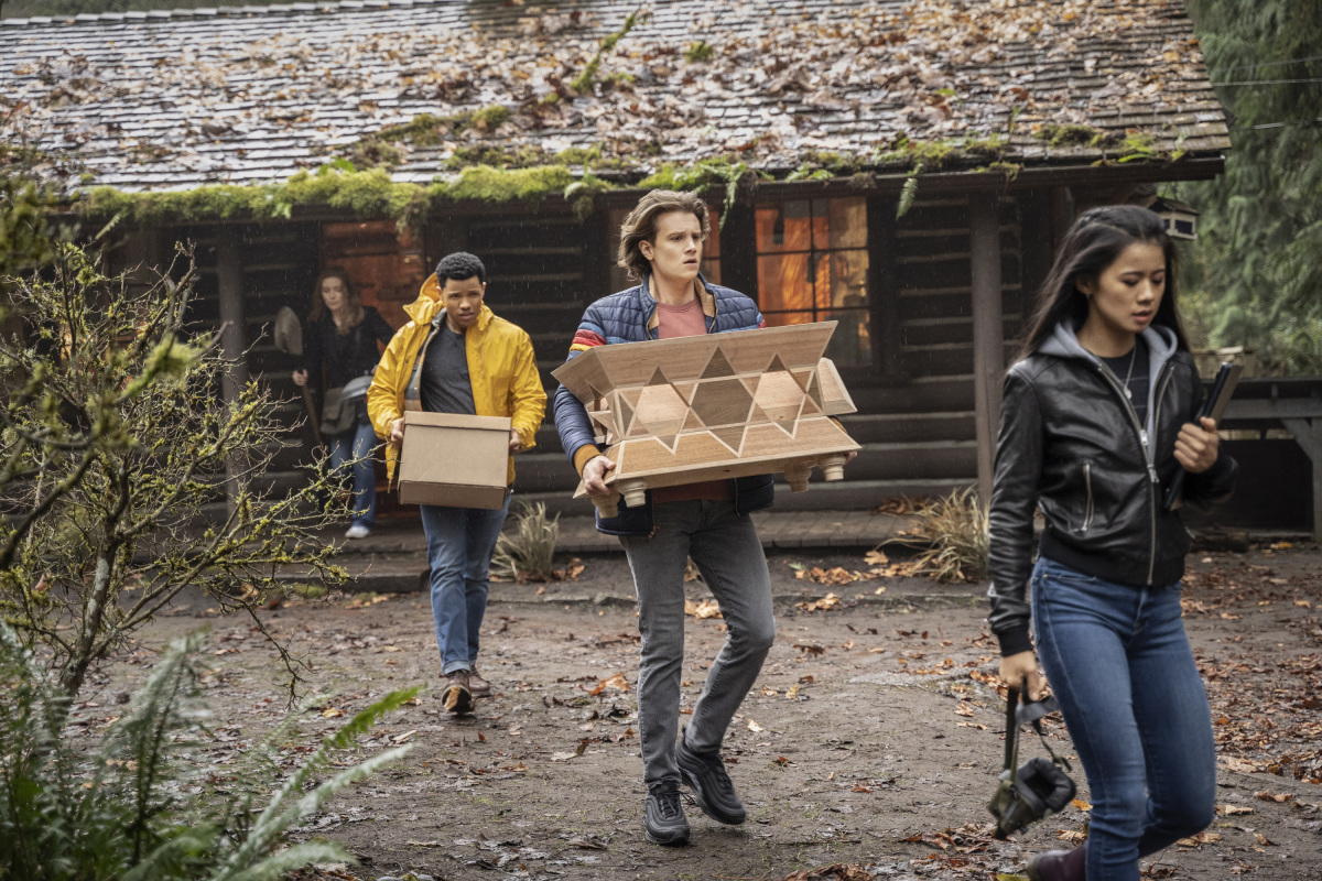 - Nancy Drew — “The Secret of Solitary Scribe” — Image Number: NCD203b_0027r.jpg — Pictured (L-R): Kennedy McMann as Nancy, Tunji Kasim as Nick, Alex Saxon as Ace and Leah Lewis as George — Photo: Colin Bentleyl/The CW — © 2021 The CW Network, LLC. All Rights Reserved.