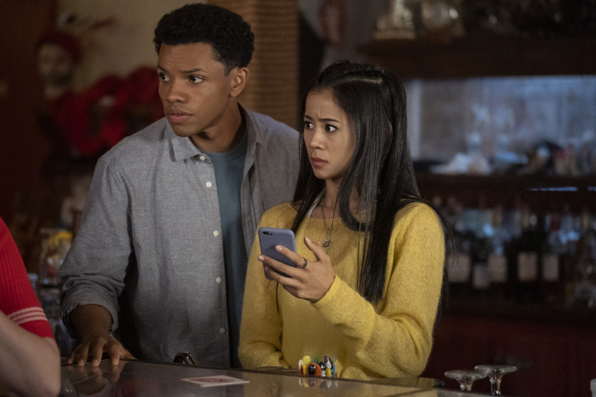 - Nancy Drew — “The Secret of Solitary Scribe” — Image Number: NCD203c_0336r.jpg — Pictured (L-R): Tunji Kasim as Nick and Leah Lewis as George — Photo: Colin Bentleyl/The CW — © 2021 The CW Network, LLC. All Rights Reserved.