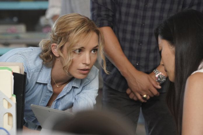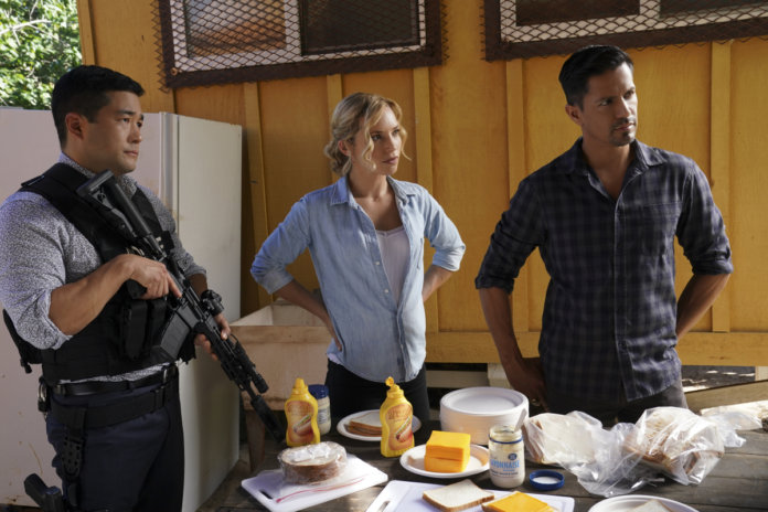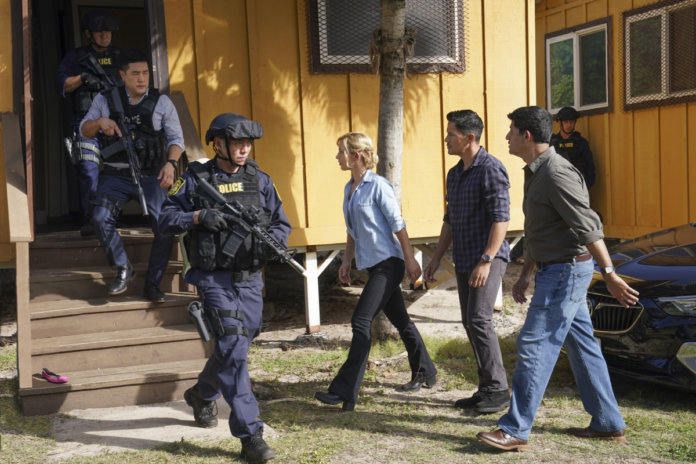 “Killer on the Midnight Watch” – When an overenthusiastic neighborhood watch group asks Magnum and Higgins to investigate a shady character living on their block, they are shocked to find that they may have inadvertently stumbled upon a serial killer on the loose. Also, Jin’s new literal money laundering business leads him to want to help a new friend, on MAGNUM P.I., Friday, Feb 5 (9:00-10:00 PM, ET/PT) on the CBS Television Network. Pictured L-R: Perdita Weeks as Juliet Higgins, Jay Hernandez as Thomas Magnum, Tim Kang as Det. Gordon Katsumoto, Jacquie Nguyen as Minh, Carolina Espiro as Nia, and Assaf Cohen as Professor Ramirez Photo: Karen Neal/CBS ©2020 CBS Broadcasting, Inc. All Rights Reserved.