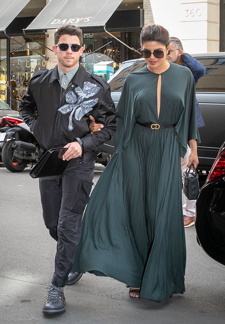 Priyanka Chopra put a dark flowy emerald gown with thigh-high slit and Christian Dior black logo belt, while Jonas wore black jacket with a gray rose on it, black cargo pants and a gray collared shirt. He also carried a leather clutch.