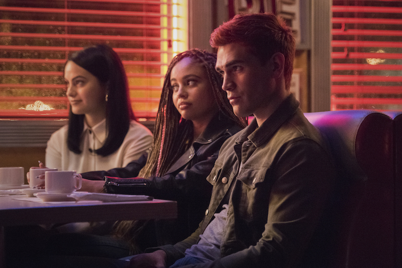 Riverdale — “Chapter Eighty-One: The Homecoming” — Image Number: RVD505b_0226r — Pictured (L-R): Camila Mendes as Veronica Lodge, Vanessa Morgan as Toni Topaz and KJ Apa as Archie Andrews — Photo: Dean Buscher/The CW — © 2021 The CW Network, LLC. All Rights Reserved.
